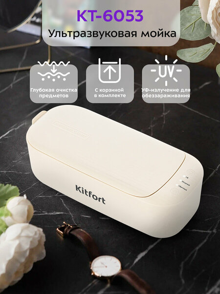 Ультразвуковая мойка КТ-6053 поможет эффективно очистить и продезинфицировать изделия из металла, пластика и стекла. Ультразвуковая очистка – способ очистки поверхности твёрдых тел в жидкости, при котором в жидкость вводятся ультразвуковые колебания. Кавитация – это явление, когда в жидкости за короткое время образуются и тут же разрушаются пузырьки воздуха. Соприкасаясь с поверхностью обрабатываемых вещей, они разрываются, создавая множество ударных волн. Так происходит глубокая очистка предметов. В крышке мойки предусмотрены 2 ультрафиолетовых светодиода. В КТ-6053 применяется ультрафиолетовая лампа с длиной волны UV-C и UV-A. UV-C лампу называют бактерицидной из-за высокой обеззараживающей эффективности по отношению к бактериям и вирусам. Управление осуществляется сенсорными кнопками. Вы можете выбрать один из 3 режимов работы: обычная чистка и УФ-излучение, усиленная чистка и УФ-излучение или только УФ-излучение. По прошествии установленного времени работы мойка автоматически отключается. В комплекте к КТ-6053 идёт корзина, в которой можно очищать небольшие предметы. Также данную корзину можно использовать как основу для очистки ремешка часов. Перед чисткой ремешка обязательно снимите его с часов и установите на корзину. Ультразвуковая мойка работает от сети. Длина провода составляет 0,8 метров, что позволит вам удобно расположить прибор. Корпус прибора сделан из пластика, а резервуар, в который помещаются предметы для очистки, - из нержавеющей стали. Благодаря небольшому размеру мойка не займёт много места у вас в доме.