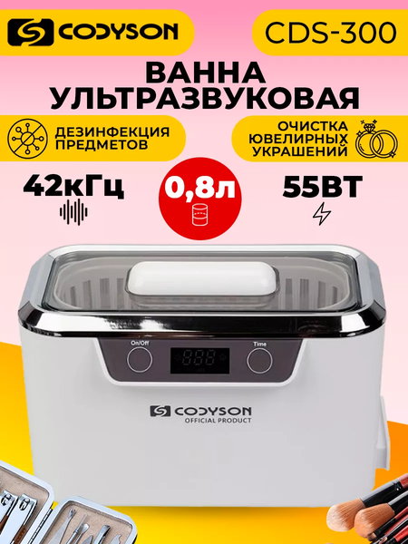 Ванна ультразвуковая CODYSON CDS-300 - надежный и профессиональный инструмент для ультразвуковой мойки и чистки, предотвращает повреждение деликатных изделий. Предназначена для очистки предметов из металлов и пластмасс, включая маникюрные, медицинские и стоматологические инструменты, ювелирные украшения. Отлично подходит для очистки линз, очков, электроники, деталей, ручек и прочего. Она оснащена технологией волн высокой частоты, которая способна очистить любые загрязнения с поверхностей из металлов и пластмасс, после удаления грязи маникюрные инструменты не затупятся, исключено появление механических повреждений. Объем емкости составляет 800 мл, что делает ее подходящей для использования в медицинских, стоматологических и маникюрных целях. Длина провода 1,5 м. Очиститель имеет LED-дисплей и пять уровней настройки таймера. Резервуар у мойки изготовлен из коррозионностойкой стали SUS304, а корпус стерилизатора инструментов выполнен из медицинского пластика ABS. С помощью ультразвуковых волн устройство эффективно очистит даже самые труднодоступные участки, удаляя все остатки органики, налет и жировые отложения. Способ применения: 1. Откройте крышку и заполните емкость дистиллированной водой. Внимание! Включение прибора без воды может привести к поломке! 2. Погрузите предмет в воду, чтобы он был полностью покрыт водой. Не превышайте максимальный уровень жидкости, обозначенный на емкости. 3. Закройте крышку и подключите аппарат к сети. 4. При включении автоматически сработает таймер на 1,5 минуты. Нажимая кнопку таймера, вы можете выставить 3, 4,6,8 минут и так далее. Во время процесса отмывки ванна будет издавать жужжание. 5. Нажмите кнопку включения/выключения для начала работы, для остановки работы нажмите кнопку снова. 6. После завершения процесса очистки отключите прибор от сети, откройте крышку, достаньте предмет. Слейте жидкость, вытрите емкость насухо. Эта ультразвуковая мойка является идеальным решением для мастеров маникюра и педикюра, так как позволяет быстро и эффективно удалять загрязнения, микробов и бактериальные остатки с их инструментов. Компактный и стильный дизайн устройства позволяет удобно разместить его в любом рабочем пространстве, будь то небольшой домашний уголок или просторный салон красоты. Ультразвуковая ванна проста в эксплуатации — всего несколько кнопок и удобный интерфейс делают её использование интуитивно понятным даже для новичков. Не откладывайте на потом чистку и дезинфекцию предметов повседневного пользования. С ультразвуковой ванной вы сможете легко и быстро справиться с этой задачей, сохраняя их идеальный вид и безупречную гигиену.