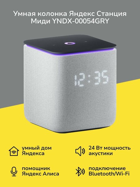 Умная колонка Яндекс Станция Миди с Алисой, серый - устройство мощностью 24 Вт, которое формирует чистый звук с ярко выраженными басами. Это делает ее оптимальным выбором для музыкальных композиций любых жанров. Поддерживается сопряжение со смартфоном, планшетом и другими устройствами посредством версии Bluetooth 5.0 и Wi-Fi (частота 2,4/5 ГГц). Четыре встроенных микрофона с высокой точностью воспринимают команды - в том числе в просторной комнате. Виртуальный помощник Алиса оперативно откликается на голос и обрабатывает поступивший запрос. В колонку уже встроен хаб управления ZigBee. Благодаря этому она может непосредственно взаимодействовать с элементами (в том числе датчиками), входящими в систему умного дома, которые работают по аналогичному протоколу. Предусмотрен режим радионяни, в рамках которого Алиса передает звуки из детской комнаты на телефон или другую аналогичную умную колонку. На колонку можно позвонить из приложения Дом с Алисой. Вся информация отображается на LED-дисплее. Предусмотрена яркая и эффектная подсветка (круговая). В комплект входят блок питания и USB-кабель. Предусмотрена функция автоматического переключения напряжения. Вес модели при размерах 110х96х96 мм составляет 900 г.