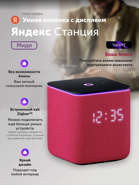 Умная колонка Яндекс. Станция Миди YNDX-00054 выполнена в корпусе с тканевой отделкой и контурной подсветкой RGB. Акустическая система с 1 НЧ-динамиком 63 мм, 2 ВЧ-динамиками 20 мм и 2 пассивными излучателями мощностью 24 Вт воспроизводит четкий звук с объемным басом. Четыре микрофона отвечают за чистую передачу голоса. Технология Room Correction адаптирует звучание под форму и площадь комнаты. На верхней панели расположены сенсорные кнопки управления. Одна из особенностей колонки Яндекс. Станция Миди YNDX-00054 – встроенный хаб Zigbee для управления устройствами умного дома. Голосовой помощник Алиса работает совместно с нейросетью YandexGPT. Она удерживает контекст из разговора и задает вопросы, если необходимо уточнение. На основе голосовых запросов Алиса находит информацию, включает музыку, вызывает такси. С ней можно говорить шепотом, чтобы не разбудить близких. Функции просмотра мультимедийного контента, прослушивания музыки и аудиокниг доступны при активной подписке семейства Плюс.