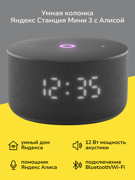 Умная колонка Яндекс Станция Мини 3 с голосовым помощником Алисой на YandexGPT, черная, получила обновленный дизайн. Особая акустическая ткань улучшает звучание. • 32-сегментный монохромный LED-дисплей Отображает время и глазки - эмоции Алисы. • Мощность 12 Вт и широкополосный динамик новой конструкции Выдает выразительный звук с большим запасом громкости и выраженными басами. Диапазон частот - от 110 Гц до 16000 Гц. • Поддержка YandexGPT Можно давать Алисе сложные задачи по генерации и редактуре текстов, изображений и различных идей. Колонка получила возможность отдавать Алисе сразу две команды - она сможет их понять и выполнить. Теперь сложные запросы распознаются и делятся на более простые, что позволяет экономить время. Например, можно попросить выключить музыку и запустить робот-пылесос - колонка станет часть эко-системы умного дома. Три встроенных микрофона точно передают речь, отключить их можно при помощи одной физической кнопки. Также колонка оснащена тремя сенсорными кнопками.