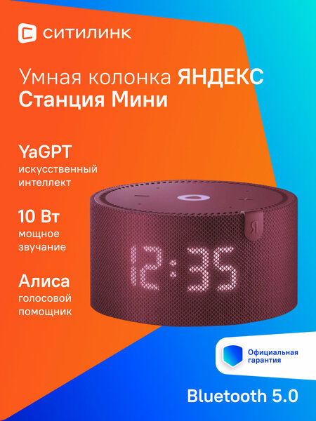 Умная колонка яндекс Станция Мини с часами с Алисой в ярком цвете красный гранат станет приятным дополнением для любого интерьера. Показ времени и проигрывание музыки – далеко не единственные ее возможности: • Алиса разбудит утром, включит любимую музыку и вызовет такси. • Поможет занять детей – Алиса моментально ответит на любой вопрос, например, сколько будет 3 плюс 2, или расскажет сказку. • 4 встроенных микрофона позволяют использовать Станцию Мини в качестве радионяни. Алиса моментально передаст на телефон любой шорох в детской комнате. • Встроенный динамик мощностью 10 Вт можно усилить, если подключить к станции другие колонки через AUX-кабель. Станцию Мини с часами можно интегрировать в систему Умный дом. С помощью колонки можно включать и выключать электроприборы и свет, при наличии умных розеток и лампочек. В паре с умным пультом и любым кондиционером, можно контролировать температуру в квартире. Подключайте широкий ассортимент совместимых умных устройства в Умный дом с Алисой и управляйте ими голосом с помощью Станции Мини с часами.