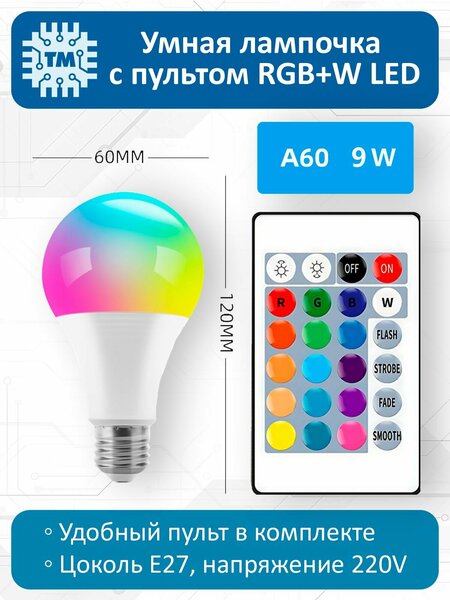 Представляем вам умную лампочку с пультом Bluetooth LED RGB+W E27 A60 9W 220V — идеальное решение для создания яркой и стильной атмосферы в вашем доме! Эта лампочка предлагает вам возможность выбора из множества цветов, позволяя легко адаптировать освещение под ваше настроение или событие. С мощностью всего 9 Вт, напряжением 220V и стандартным патроном E27, она идеально подходит для любого интерьера. Управление осуществляется с помощью удобного пульта, который позволяет менять яркость и цвет света на расстоянии, не вставая с места. Лампочка также отличается низким энергопотреблением, что поможет вам сэкономить на счетах за электричество, при этом обеспечивая срок службы до 30,000 часов. Создайте уютную обстановку для отдыха или яркое освещение для вечеринок с умной лампочкой RGB+W E27 A60!