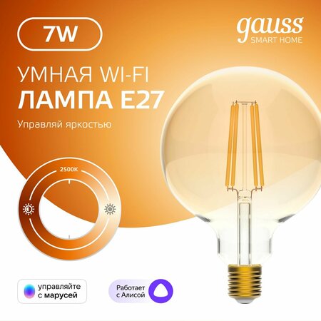 Умная Wi-fi филаментная лампочка Gauss Smart Light DIM E27 G95 7 Вт 2700-6500K, диммируемая, управление голосом/смартфоном Дистанционное управление: управляйте светом через мобильное приложение или голосовой помощник (Алиса, Siri, Google, Маруся) ∙ Установка расписаний: автоматизируйте пространство. Свет будет включаться и выключаться по вашему расписанию. ∙ Режимы: режимы созданы в Париже специалистами по световым решениям. ∙ Сцены: понравился режим в той или иной комнате? Зафиксируйте его в сцене и включайте одним кликом на смартфоне Умный дом начинается с лампочки Gauss Smart! Помимо филаментных ламп в ассортименте бренда представлены и другие умные устройства, среди которых: лента, датчик движения, розетка, светодиодные лампы, а также встраиваемые и накладные светильники. Управляйте светом – управляйте вдохновением
