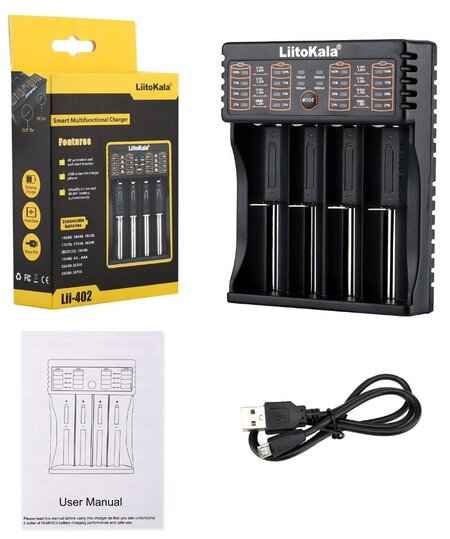 LiitoKala Engineer Lii-402 - универсальное интеллектуальное зарядное устройство, совместимое практически со всеми цилиндрическими аккумуляторами, тем самым устраняющее необходимость использования нескольких зарядных устройств. Lii-402 автоматически распознает литий-ионные, никель-металлгидридные и никель-кадмиевые аккумуляторы, заряжает литий-фосфатные (LiFePO4) аккумуляторы, а так же Li-ION аккумуляторы с конечным напряжением 4,35в. Особенности: