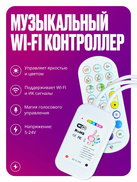 Умный контроллер Wi-Fi с пультом: голос, музыка и полный контроль над атмосферой дома. Этот компактный, но мощный музыкальный диммер-контроллер для 2 RGBW лент, 5-24 V, на 144 Вт открывает новые горизонты в управлении освещением, превращая обычную подсветку в динамичное шоу. Голосовое управление через Алису Больше не нужно искать пульт для светодиодной ленты или отвлекаться от дел — просто попросите Алису сменить цвет, яркость или режим работы лент. Интеграция с экосистемой Яндекса делает управление естественным и интуитивным. Живая синхронизация с музыкой Встроенный высокочувствительный микрофон улавливает малейшие нюансы звука, превращая мелодию в захватывающую игру света. Глубокие басы, ритмичные ударные, плавные переходы — всё это отражается в переливах умной RGB-подсветки, создавая эффект настоящего домашнего светомузыкального шоу. Универсальное управление: голос, пульт, смартфон Помимо голосовых команд, в комплекте идёт ИК-пульт для ручного переключения режимов, а мобильное приложение позволяет тонко настраивать сценарии умного освещения из любой точки мира. Мощность для масштабных проектов Умный контроллер для светодиодной ленты мощностью до 144 Вт – поддерживает две ленты по 15 метров (если речь идет о стандартном типе со светодиодом SMD RGBW 5050, он потребляет 4,8 Вт на метр), что позволяет организовать подсветку не только в комнате, но и в просторной гостиной или даже на террасе. Важный момент: будьте внимательны при выборе блока питания — подключение 12-вольтовой ленты к 24V блоку может привести к перегоранию светодиодов. Всегда проверяйте соответствие напряжения! Он управляет обеими led-лентами одновременно, раздельное управление недоступно. Простое подключение: 1. Контроллер для RGBW ленты имеет 4 контакта для питания и 3 выхода на цвета (красный, зелёный, синий). Подсоедините ленты, а затем подключите блок питания. 2. Загрузите приложение Digma Smart Life, найдите устройство в списке доступных и выполните сопряжение. Интерфейс интуитивно понятен даже для новичков. 3. Свяжите контроллер для светодиодной ленты с Алисой к своему аккаунту Яндекса — теперь можно управлять светом через голосовые команды, даже если вас нет дома. Готово! Теперь ваше умное освещение оживает: оно танцует под музыку, подстраивается под настроение и откликается на каждое слово.