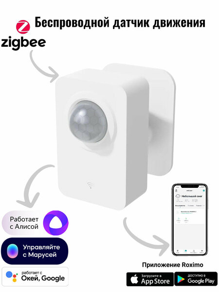 Умный Zigbee датчик движения ROXIMO SZP06 - это одно из устройств экосистемы умного дома Roximo. Подключается к сети через специальный Zigbee шлюз, например модель Roximo GWZBT01. Прямое подключение к Zigbee от Яндекс - подключайте устройства Roximo прямо к Станции с поддержкой Zigbee или хабу Яндекс. Датчик имеет компактный размер и работает от двух пальчиковых батареек типа АА, которых хватает от нескольких месяцев до нескольких лет за счет использования беспроводной технологии Zigbee. В комплекте поставляется шариковое настенное крепление. Датчик снабжен PIR (пассивным инфракрасным сенсором), который обеспечивает точное определение движения человека на расстоянии до 8 метров и с углом обзора 128 градусов по вертикали и горизонтали. В приложении Roxiomo IoT датчики безопасности можно использовать с комплексом охранных функций, а именно переводить все датчики одним нажатием в охранный режим и получать уведомления на смартфон о тревожных событиях в Вашем доме. Можно добавлять умные сценарии на включение или отключение других устройств в умном доме при срабатывании датчика, например включение освещения или активация записи с камеры наблюдения. Интеграция устройств с популярными голосовыми помощниками и умными колонками: Google Assistant, Yandex Алиса, Маруся от Mail_ru Group и др. - позволяет управлять умными устройствами голосом. Все, что Вам требуется - это наличие Zigbee шлюза (например Roximo GWZBT01) в Вашем доме. Вам просто нужно включить устройство Roximo IoT, добавить его в приложение. Все устройства в приложении Roximo IoT могут быть связаны между собой, независимо от технологии подключения к сети: WiFi, Bluetooth или Zigbee. Загрузите в свой смартфон приложение Roximo IoT. Добро пожаловать в умный дом Roximo!