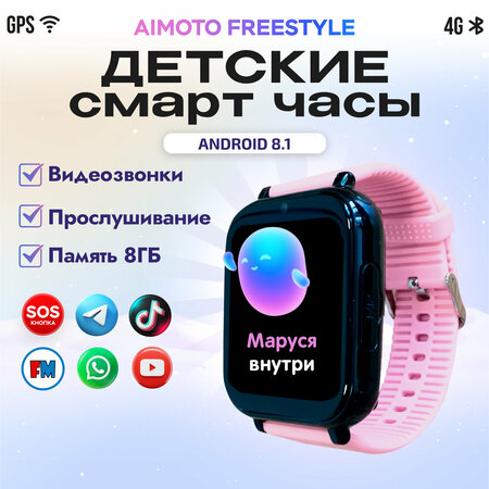 Самая популярная новинка smart часов от бренда Aimoto для тех родителей, кто ищет сенсорные смарт часы на Android 8.1 с Марусей, с кнопкой SOS, с видеозвонком, GPS трекером, удаленным аудио мониторингом, фото мониторингом, звонками в WhatsApp, просмотром видео в YouTube, возможностью загружать с ноутбука и смотреть видео, аудио, файлы, общаться с голосовым помощником Маруся. Часами можно пользоваться от сети WiFi как смартфоном. - В часах есть голосовой ассистент Маруся от VK. Маруся очень дружелюбная и дети ее обожают, она поиграет с ребенком в игры, расскажет сказку или стих, поможет выучить таблицу умножения и английский! - Установлены мессенджеры WhatsApp и Telegram с родительским контролем. - Google-переводчик голосовой - Аудио и видеоплеер. - Face ID - система распознавания лица, позволяющая безопасно разблокировать устройство. - В часах можно настраивать сменные экраны, анимированные и яркие заставки и картинки, устанавливать мелодии на звонок, а также устанавливать "маски" на камеру. - Aimoto Freestyle - это надежные 4G часы, c большим сенсорным IPS экраном 1.85”. - Удобный и понятный интерфейс.