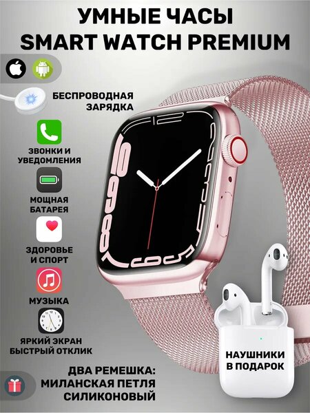 Умные Смарт часы наручные женские мужские - аналог премиальных брендов, по доступной цене. Беспроводные Bluetooth наушники в подарок. Умные часы нового поколения, с увеличенным безрамочным экраном и мощной батареей. Умные часы - абсолютная новинка! По-настоящему тонкие рамки, большой Ultra Full Screen дисплей с разрешением 390х435, ультра-быстрый сенсор, плавная анимация, новый производительный процессор RTd8762DK, звонки по Bluetooth версии 5.0 и выше и уведомления из социальных сетей и мессенджеров. Умные часы могут измерять более 7 показателей, артериальное давление, пульс, уровень кислорода в крови и др. параметры здоровья. Качественные микрофон и динамик позволяют отвечать на звонки и разговаривать прямо через часы, не доставая смартфон! Часы оборудованы аккумулятором емкостью 380 mAh, что позволяет работать без подзарядки до 3 дней в стандартном режиме. Боковая кнопка и функциональное колесо Digital Crown. Мультиспортивный режим, секундомер, калькулятор. Размер часов 45х38х11 мм. Защита от пыли и влаги IP67 - часы имеют защиту от попадания пыли, дождя и брызг. Наручные часы нельзя погружать под воду, т. к. это приведет к поломке, которая не является гарантийным случаем. Подключение к телефону с помощью Bluetooth 5.0 и выше. Smart Watch - это отличный подарок на День Рождения, Новый год, 14 февраля, 23 февраля и 8 марта.(Не имеют разъема для сим карты и работают через синхронизацию с телефоном через блютуз!)Перед первым использованием поставьте часы на зарядку на 3 часа! Для зарядки смарт - часов следует использовать низковольтный Адаптер (блок питания) до 1 Ампер. После настройки смарт-часов, зарядите их несколько раз от 30 % до 100 % зарядки, не допуская разряда в ноль! В первую разрядку смарт- часы могут заряжаться до суток!