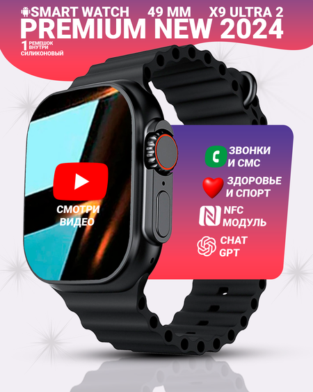 почувствуйте будущее на своём запястье! X9 ULTRA2 — это не просто часы, это ваш персональный помощник, который всегда с вами! Огромный 2.2-дюймовый экран заставит вас влюбиться с первого взгляда, а стильный металлический корпус подчеркнет ваш безупречный вкус. следите за здоровьем без лишних усилий Ваше сердце будет под постоянным контролем! X9 ULTRA2 непрерывно анализирует пульс, качество сна и физическую активность. Просыпайтесь бодрыми и энергичными каждый день благодаря умному будильнику, который разбудит вас в оптимальную фазу сна! оставайтесь на связи В любой ситуации Больше никаких пропущенных звонков и сообщений! Принимайте вызовы прямо с часов благодаря встроенному динамику и микрофону. Увидите имя звонящего и сможете ответить даже когда смартфон не под рукой. платите легко И безопасно Забудьте о кошельке и наличных! Встроенный NFC-модуль позволяет расплачиваться за покупки одним движением руки. Быстро, удобно и безопасно в любом магазине с бесконтактной оплатой. заряд энергии на ВСЮ неделю Мощный аккумулятор 350 мАч обеспечивает до 72 часов активной работы! А когда придёт время подзарядки, просто положите часы на стильную магнитную зарядку — никаких проводов и разъемов. НЕ бойтесь приключений Защита IP67 надежно оберегает ваши смарт-часы от пыли и случайных брызг. Занимайтесь спортом и путешествуйте, не беспокоясь о сохранности гаджета! Часы X9 ULTRA2 совместимы со всеми современными смартфонами на Android и iOS. Управляйте музыкой, делайте фото со смартфона одним касанием часов и используйте множество других полезных функций! В комплекте: • Смарт-часы X9 ULTRA2 • Стильный силиконовый ремешок • Беспроводная магнитная зарядка • Инструкция на русском языке покупайте сейчас и превратите ваши будни в комфортное приключение с умными часами X9 ULTRA2!