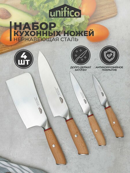 Эстетичный и функциональный набор профессиональных ножей из нержавеющей стали Trevi от бренда Unifico будет полезен на каждой кухне. Состоит из 4 предметов: шеф нож, топорик, универсальный нож и нож для овощей. Эти ножи подходят для нарезки, резки, разделки мяса, рыбы, овощей, хлеба и других продуктов. Благодаря применению нержавеющей стали марки 3CR13, лезвия ножей отличаются прочностью и долговечностью, устойчивы к коррозии и обладают превосходной износостойкостью. Двухсторонняя заточка ножей обеспечивает высокую эффективность резки позволяя ножам уверенно справляться с любыми кулинарными задачами от нарезки овощей до разделки мяса. Рукоятка ножей из натурального оливкового дерева со специальной защитной обработкой и стильный металлический наконечник придает им красоту и элегантность. Подарочный набор кухонных ножей с рукояткой из дерева Unifico — стильный и функциональный помощник для создания кулинарных шедевров. Надежность, комфорт и современный дизайн делают его идеальным выбором для вдохновения каждого любителя и профессионального повара готовки. Ножи в магнитной коробке 4 предмета: Шеф-нож - длина лезвия 20 см, толщина лезвия 2,2-2,5 мм, вес 195 г, длина ножа с ручкой 33,5 см Универсальный нож - длина лезвия 12 см, толщина лезвия 1,8- 1,5 мм, вес 85 г, длина ножа с ручкой 24 см Нож для овощей - длина лезвия 9 см, толщина лезвия 1,8- 1,5 мм, вес 75 г, длина ножа с ручкой 20,5 см Топорик - длина лезвия 16,5 см , толщина лезвия 2,5-3,0 мм, вес 315 г, длина ножа с ручкой 30 см