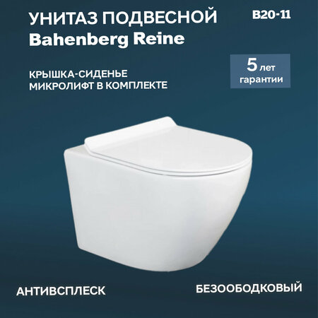 Унитаз подвесной Bahenberg Reine B20-11 – станет отличным решением как для санузла, так и для совмещенной ванной комнаты. Благодаря компактности, а также эргономичности это изделие можно с легкостью разместить даже в маленькой комнате. Уникальность конструкции заключается еще и в том, что чашу легко мыть, поддерживать в чистоте. Новое поколение безободковых унитазов с защитой от выплескивания. Унитаз подвесной безободковый – 100% омывание чаши. Подходит ко всем стандартным инсталляциям. В комплекте ультра-тонкое сиденье из антибактериального дюропласта. Легкое снятие сиденья нажатием одной кнопки. Скрытый крепеж с фиксацией через отверстия для сиденья. Весь крепеж в комплекте. Материал: стекловидный фарфор. Выпуск: горизонтальный. Сиденье: тонкое и быстросъемное с функцией микролифт, плоская крышка. Дюропласт. Безободковый. Антивсплеск. Антигрязевое покрытие. Полный комплект для подключения, инсталляция с двойной белой кнопкой смыва.