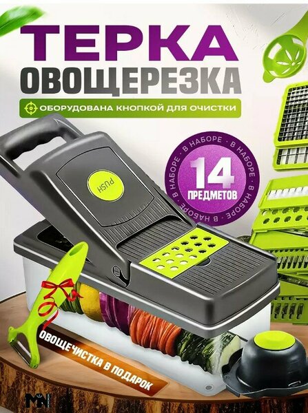 Достоинства:Много разных тёрок, компактна Недостатки:Не такой набор, как на картинке. Липкое качество Комментарий:Пришёл набор немного другого содержания. В наборе нет овощечситки и толтко 5 тёрок. Крышка не закрывается, когда вставлен контейнер с решёткой. Какое-то ощущение, что уже пользованное, хотя все было в упаковке. Коробка мятая, вроде бы все новое, но какое-то корявое. Маркет, Пожалуйста, не скатывайтесь до WB.