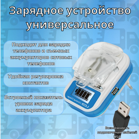 Сетевое зарядное устройство лягушка для аккумуляторов мобильных телефонов и смартфонов с портом USB и LCD дисплеем. Зарядное устройство - "лягушка" с дисплеем одно зарядное устройство для всех мобильных устройств в доме! Универсальное зарядное устройство "лягушка" уникально в своем роде. Имея регулируемые контакты, возможно осуществить зарядку практически любого аккумулятора для сотового телефона, коммуникатора, фотоаппарата, GPS приемника, видеокамеры и т. п. - Чтобы заряд пошел, соедините контакты батареи с зарядным устройством и установите последнее в розетку. - Полярность на клеммах определится автоматически. Универсальное зарядное устройство "лягушка" станет вторым шансом для смартфонов со сломанным разъемом питания.- Цикл заряда стандартной батареи емкостью 650 мАч составляет 1.5 часа.- Уникальный микрочип универсального зарядного устройства постоянно следит за процессом заряда и сам произведет прекращение зарядки в момент полного заряда батареи. ! ВНИМАНИЕ! Лягушка может быть любого цвета! Без выбора