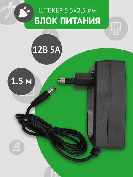 Универсальный блок питания 12В 5А, штекер 5.5х2.5 мм, адаптер питания 12V 5А. БЕЗ индикатора работы