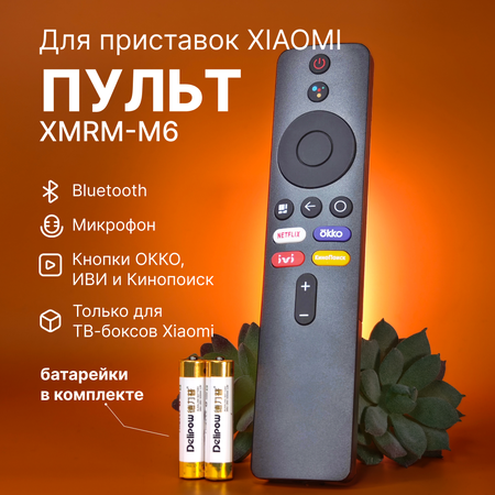 Универсальный пульт дистанционного управления XMRM-M6 — это инновационное устройство, обеспечивающее надежное и удобное управление вашими устройствами благодаря поддержке инфракрасного и Bluetooth-подключения. Он идеально подходит для современных приставок бренда Xiaomi, предлагая широкие функциональные возможности. важно! Пульт предназначен для приставок, однако подходит к некоторым ТВ - что не является функционально заложенным. В связи с этим может не работать функция включения ТВ, так как пульт ориентирован для ресиверов - приставок. Для того, чтобы произвести сопряжение по Bluetooth необходимо: зажать на пульте кнопки, согласно инструкции в карточке товара, "Меню" + "О" на 3-5 сек. Пульт оснащен 16 клавишами, включая навигационное кольцо, регулировку громкости, доступ к меню, кнопки для стриминговых сервисов и домашней панели смарт ТВ. Пульт XMRM-M6 питается от двух батареек AAA, что обеспечивает длительный срок службы. Его компактные размеры (164мм * 38мм * 15мм) и легкий вес (всего 45 г) делают его удобным для ежедневного использования. Обратите Внимание! Кнопки стриминговых сервисов будут работать при условии, если ваш телевизор поддерживал эти функции с оригинальным пультом. В ином случае, кнопки сервисов работать не будут. Технические характеристики: Название модели — XMRM-M6 Тип передачи - Инфракрасное и Bluetooth-подключение Гироскоп — Нет Рабочее расстояние — До 10 метров без препятствий Батарейка — ААА 2шт. Вес продукта — 45 г. Размеры пульта ДУ (ДхШхВ) — 164мм*38мм*15мм