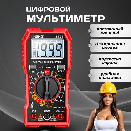 Материал: ABS пластик Цвет: черный/красный Размер: около 132,3 * 66,5 * 37 мм Вес: около 101 г Питание: 2хААА батарейки (в комплект не входят) Особенности: Удобная подставка Тестирование диодов Фиксация показаний на дисплее Яркий ЖК экран с подсветкой Измерение постоянного напряжения Измерение переменного напряжения Измерение постоянного тока Измерение постоянного тока в миллиамперах mA Измерение сопротивления Прозвонка цепи Автоматическое выключение Цифровой мультиметр - это современное устройство нового поколения, которое сочетает в себе функции мультиметра, тестера. Он предназначен для измерения напряжения, сопротивления, прозвонки целостности цепи, измерения постоянного и переменного напряжения, постоянного тока. Результаты измерений выводятся на цифровой дисплей высокой четкости с подсветкой, что обеспечивает удобство использования в условиях недостаточного освещения. Благодаря автоматическому отключению, тестер экономит заряд батареек и продлевает их срок службы. Тестер выполнен из качественного материала - ABS и силикона, что обеспечивает его долговечность и надежность в использовании. Цвет корпуса - красный с черным Руководство на английском языке Батарея: 2 × батарейки типа AAA (не входят в комплект)