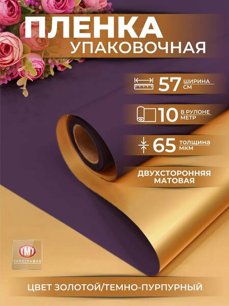 Упаковочная бумага для подарков и цветов, двусторонняя матовая, 0.57х10м, цвет золотой/темно-пурпурный