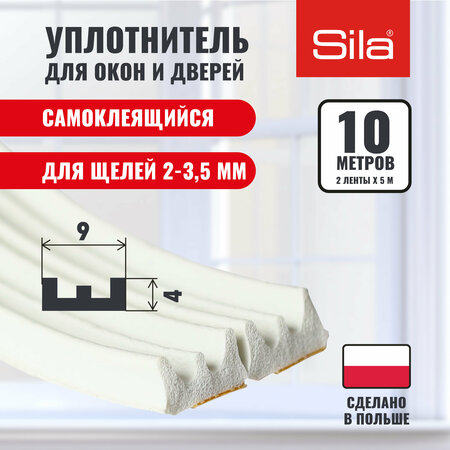 Уплотнитель для окон и дверей SILA E-профиль, 9х4мм, 10 метров (2х5м), белый, самоклеящийся SILAEW10