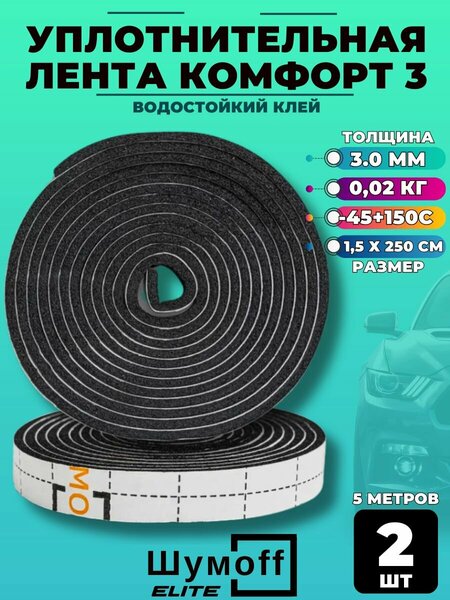 Шумофф Комфорт 3 в деталях является звуко-теплоизоляционным, уплотнительным самоклеящимся материалом на основе вспененной резины черного цвета. Материал низко горючий и не впитывает воду, эластичный, легко принимает нужную форму, герметизирует щели, стыки, не пропуская воду. Водостойкий клеевой монтажный слой защищен антиадгезионной бумагой с фирменным логотипом и линовкой. Уплотнительная лента применяется в стыки деталей, уплотняет зазоры дверей, исключает скрип деталей, под динамики для герметичности объема, для плотного прилегания бардачков, как антискрип для автомобиля. В быту применяется для уплотнения окон, ванн, моек, входных дверей, герметичности сантехники, предотвращает утечку воды, воздуха. Рекомендуемые зоны применения и примерное кол-во деталей на зону: - Стыки пластиковых деталей обшивки - Окантовка дверей: на 4 двери, 4 - 5 рулонов - Проводка Деталь изготавливается в виде самоклеящейся уплотнительной ленты размером 15 х 2500 мм, толщина 3 мм. Гарантийный срок до монтажа 2 года.