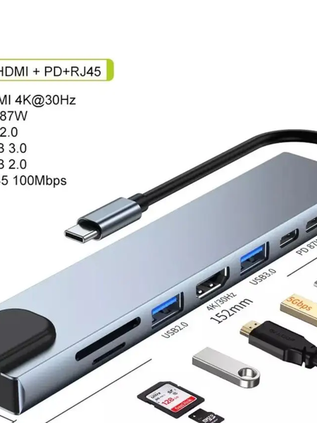 Многофункциональный универсальный переходник, адаптер, картридер, usb hub 8 в 1 usb, разветвитель 8-порта адаптер, док станция 4K HDMI Type-C USB-3.0 USB-2.0 TF/SD Картридер USB-HUB для Macbook 8 в 1. Интерфейс подключения USB - Type C. Длина адаптера 15,2 см, ширина 3,2 см, высота 1,3 см. Длина провода 12 см. Type-C to 1 PD Charging & Data Port (87W) + 1 PD 2.0 + 1 USB3.0 + 1 USB2.0 + 1 SD + 1 TF + 1 HDMI 4K@30Hz + RJ45 100 Mbps Размеры: 152мм х 32мм х 13мм, длина шнура 12см. Цвет корпуса - серебро