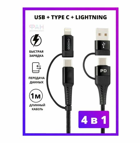 CKCOCO 4в1 – это качественный универсальный кабель для зарядки гаджетов и обмена данными с 4 разными интерфейсами. Левый и правый интерфейсы Type C имеют насадки USB и Lightning. CKCOCO 4в1 – это один кабель вместо четырёх: кабель Type C + Type C, кабель USB + Type C, кабель Lightning + USB, Type C + Lightning. Заряжайте любые устройства с разъёмами Type C и Lightning, обменивайтесь данными между системами Windows, Android и iOS. Переходник Type C обеспечивает быструю зарядку и быстрый обмен данными. Длина кабеля 1 метр, пропускной ток 3A, цвет чёрный. Кабель USB C имеет прочную тканевую оплётку и защищен от перегибов, не запутывается и не рвётся. Lightning кабель выполнен из качественных и нетоксичных материалов.