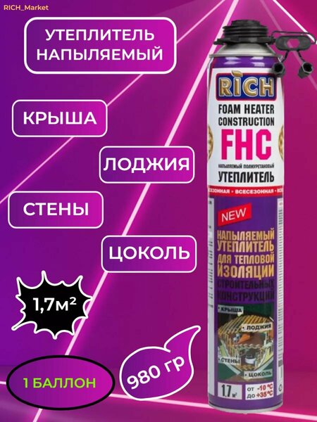 Утеплитель RICH представляет собой однокомпонентный полиуретановый напыляемый утеплитель в аэрозольной упаковке. Он предназначен для утепления различных поверхностей, включая стены, перегородки, трубопроводы, транспортные средства специального назначения и другие. Утеплитель RICH обладает высокой адгезией к различным строительным материалам, таким как металл, дерево, бетон, кирпич, газобетон и другие. Это позволяет использовать его для утепления самых разных поверхностей. Утеплитель RICH имеет высокие теплоизолирующие свойства, что обеспечивает эффективное сохранение тепла внутри помещений. Утеплитель RICH можно наносить на неровные поверхности и труднодоступные места, что значительно упрощает процесс утепления. Производительность утеплителя составляет 1,7 м2 при толщине слоя 5 см. Упаковка утеплителя содержит 1 баллон объемом 0.89 литра. Минимальная температура эксплуатации составляет -10 градусов, а максимальная - 35 градусов. Выбирая утеплитель RICH, вы получаете качественный продукт, который поможет вам сохранить тепло и уют в вашем доме или на рабочем месте.