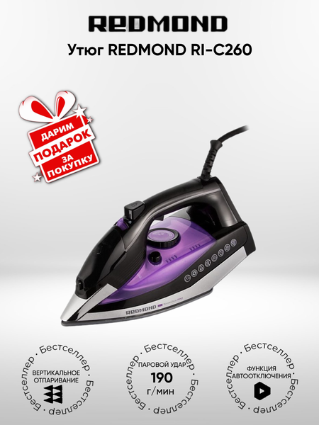 Описание моделиREDMOND RI-C260 – современный утюг из серии Boost Glide Pro с надежным механизмом для комфортного и безопасного глажения. Подошва Boost GlideБлагодаря покрытию из композитной керамики подошва утюга безупречно скользит по любой ткани, не цепляя ее. RI-C260 мгновенно разгладит жесткий лен, мятый хлопок и деликатный шелк. Композитная подошва отличается повышенной износоустойчивостью, что позволяет продлить срок службы утюга. Высокая мощностьМощность 2500 Вт обеспечивает быстрый нагрев подошвы и постоянное поддержание температуры в любом режиме работы: и при вертикальном отпаривании, и при сухом глажении. Паровой удар 190 г/минС помощью функции парового удара вы с легкостью разгладите заломы и жесткие складки даже на пересушенной и плотной ткани. Вертикальное отпариваниеС утюгом RI-C260 вы сможете быстро и удобно отпаривать пальто, плащи и пиджаки, не снимая их с плечиков. Используйте вертикальное отпаривание и гладьте с максимальным комфортом. АнтинакипьЧтобы при применении парового удара накипь не попала на одежду и не испортила ее, в приборе предусмотрена специальная защита. Она помогает снизить жесткость воды и препятствует образованию белого налета в соплах подошвы утюга. Если вы используете для утюга жесткую водопроводную воду, периодически используйте функцию самоочистки, чтобы продлить срок службы прибора. АнтикапляЕсли вы гладите вещи из тканей разной фактуры, вам не придется выливать воду из резервуара утюга, чтобы переключиться на сухое глажение сразу после отпаривания. Автоматическая функция «Антикапля» надежно защитит от протекания и попадания воды на одежду. Удлиненный шнурДлина шнура 3 метра позволит разместить гладильную доску так, как вам удобно или с удобством освежать шторы или портьеры. Безопасное глажениеБлагодаря прорезиненной ручке утюг очень удобно держать: он не выскользнет, даже если вы возьмете его влажными руками. Максимальную безопасность использования обеспечит функция автоматического отключения. Если прибор находится в неподвижном состоянии более 30 секунд в горизонтальном положении, и 8 минут – в вертикальном, он выключится. Эта функция также помогает экономить электроэнергию.