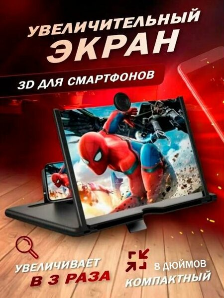 Увеличительный экран для вашего смартфона. Новинка. Позволяет просматривать картинку экрана вашего телефона в гораздо большем размере. Увеличение экрана до 5 раз без потери четкости изображения. Позволит превратить ваш смартфон в полноценный домашний кинотеатр, посмотреть любимый фильм с объемным звуком, а вашим детям посмотреть любимый мультик. Стекло увеличитель для телефона Может стать хорошим подарком. Можно использовать для чтения. Может использоваться как подставка для телефона. Макролинза для телефона-снимает усталость глаз. 8 дюймов. Размер: 210х130х130 мм.