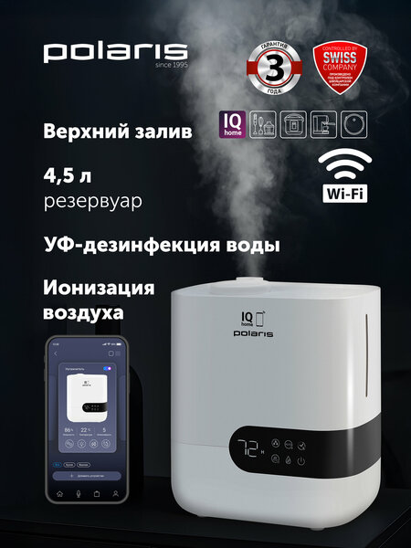 Увлажнитель воздуха Polaris PUH 4550 WIFI IQ Home - это современное устройство, которое обеспечивает оптимальное увлажнение воздуха в помещении площадью до 40 квадратных метров. Одним из ключевых преимуществ увлажнителя является его Wi-Fi управление. Вы можете управлять устройством из любой точки мира без необходимости использования дополнительного оборудования. Это делает его удобным и практичным в использовании. Увлажнитель оснащен резервуаром для воды объемом 4,5 литра, что позволяет устройству работать на протяжении длительного времени без необходимости пополнения водой. Верхний залив воды делает процесс наполнения резервуара простым и удобным. Устройство оснащено функцией УФ-стерилизации воды, что обеспечивает дополнительную защиту от бактерий и вирусов. Увлажнитель имеет 3 скорости подачи пара, что позволяет выбрать оптимальный режим для любого помещения. Функция "теплый пар" обеспечивает комфортное увлажнение воздуха в детской комнате. Устройство оснащено таймером и беззвучным режимом, что позволяет настроить работу увлажнителя на удобное для вас время. В комплекте с увлажнителем идут пульт дистанционного управления, щеточка для чистки. Увлажнитель воздуха Polaris PUH 4550 WIFI IQ Home выполнен в белом цвете и имеет влагозащищенный корпус.