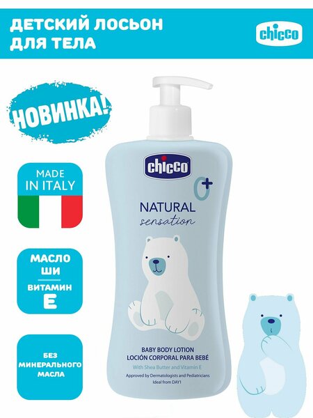 Лосьон для тела глубоко питает кожу младенца уже с первого применения, обеспечивая надлежащий уровень увлажнения. При ежедневном использовании защищает и укрепляет естественные механизмы защиты кожи в течение всего дня (24часов), при этом позволяя коже свободно дышать. Делает кожу мягкой и шелковистой. Приятная для нанесения текстура. Быстрое впитывание. Нежирная текстура. Натуральные активные вещества: Масло ши: способствует восстановлению липидного барьера кожи. Витамин E: успокаивающее и защитное действие. Рисовое масло: питающее и смягчающее действие. Масло сладкого миндаля: питающее и смягчающее действие. Аллантоин: успокаивающее и смягчающее действие. Лосьон для тела прошел клинические испытания: не оказывает раздражающего действия и подходит для детей с чувствительной кожей. Хранить в местах недоступных для детей при температуре от +4С до +40С, защищать от прямых солнечных лучей Упаковка средства на 100% состоит из переработанного пищевого пластика и пригодна к повторной переработке. Косметика Chicco Natural Sensation создана обеспечить бережный, безопасный уход за малышом с самого рождения. Все средства Chicco Natural Sensations производятся в Италии, не содержат парабенов, не содержат лаурил- и лауретсульфатов натрия (SLS/SLES), содержат увлажняющие растительные ингредиенты, клинически протестированы для чувствительной кожи и являются гипоаллергенными.