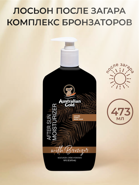 Australian Gold® After Sun Moisturizer with Bronzer - легкий увлажняющий крем для тела с бронзирующим комплексом, который помогает сохранить влагу в коже, продлить загар и легко смывается, не оставляя следов. ТЕХНОЛОГИИ: Hydration Complex: Формула с глицерином и алоэ вера повышает уровень увлажненности кожи, улучшает ее гладкость, помогает коже выглядеть молодой и продлевает загар. Nourishing Blend: Витамин Е и масло конопляного семени вместе помогают питать кожу, уменьшают воспаления и защищают ее от потери влаги. Bronzing Complex: улучшает внешний вид кожи и придает ей бронзовый оттенок. Tea Tree Oil: Мощный антиоксидант, обладающий естественными ингибиторами запаха, придающими коже свежесть.