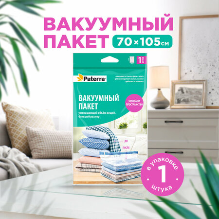 Вакуумный пакет PATERRA: эффективное хранение и защита вещей Вакуумный пакет PATERRA размером 70х105 см предназначен для длительного хранения одежды, подушек, одеял, детских вещей, мягких игрушек и других предметов. Он позволяет сэкономить до 70% полезного пространства, обеспечивая надежную защиту вещей от пыли, грязи и моли. Вакуумный пакет работает с любым пылесосом, что делает его удобным и практичным в использовании. В комплекте с пакетом идет прозрачный клапан, который обеспечивает герметичность и предотвращает утечку воздуха. Прозрачный материал пакета позволяет легко определить, какие вещи находятся внутри, а также обеспечивает визуальный контроль за состоянием вещей. Пакет предназначен для многократного использования, что делает его экономичным и экологичным решением для хранения вещей. Выбирая вакуумный пакет PATERRA, вы получаете надежное и удобное решение для хранения и защиты ваших вещей.