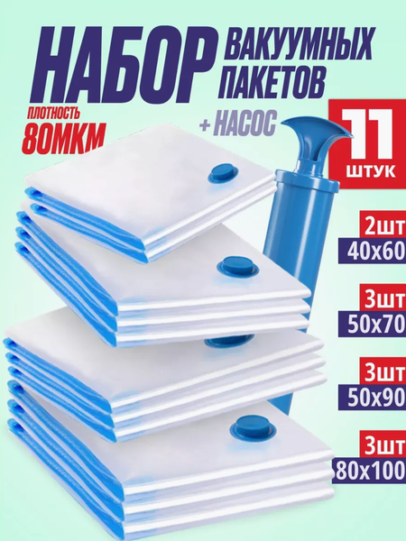 Достоинства:Качественные пакеты, удобный насос, который отлично выручит в поездках. Недостатки:нельзя выбрать только те размеры, которые необходимы. Комментарий:Большой набор был куплен сразу после того, как опробовали набор из 11 пакетов. В этом наборе большое количество средних по размеру пакетов 60*80 - целых 15 штук, плюс два вместительных пакета 80*100.