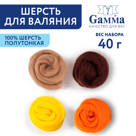 Набор из экологически чистой, полутонкой шерсти для валяния Гамма - отличный материал для творчества, вязания и рукоделия. Гребенная лента подходит для сухого и мокрого валяния, создания картин в технике шерстяная акварель. Рекомендована, в качестве учебного материала, для начинающих, а также профессионалам, для валяния мелких деталей. Шерсть отечественного производства, окрашена качественными и стойкими красителями. Валяние или фелтинг – идеальное хобби, которое не требует большого количества материалов и инструментов, отдельного помещения, им можно заниматься дома, в школьных мастерских и на мастер-классах. Аксессуары и сувениры, игрушки и предметы декора, созданные в технике фелтинг – уникальны. Они теплые, уютные, вызывающие яркие эмоции и восхищение. Прекрасный вариант подарка друзьям и близким на Новый год, 8 марта, 23 февраля. Попробуйте этот вид рукоделия, он очень увлекательный. Состав: 100% мериносовая шерсть. Длина волокна, мм: 73-75 Тонина/толщина волокна, мкр: не более 29 При соблюдении условий хранения срок годности не ограничен. Хранить в сухом, защищённом от прямых солнечных лучей месте. Не подлежит обязательной сертификации и декларированию соответствия. Наборы ассорти выпускаются в 13 вариантах цветовых сочетаний: № 1 - чёрный, отбелка, суровый, песочный № 2 - жёлтый, киви, шоколадный, терракот № 3 - красный, оранжевый, розовый, багряный № 4 - св. голубой, голубая бирюза, т. синий, лесной колокольчик № 5 - лимон, винный, голубая бирюза, яркий салат № 6 - песочный, терракот, жёлтый, оранжевый № 7 - салат, св. салат, киви, мор. водоросли № 8 - джинсовый, серый, хаки, липа № 9 - жёлтый, горчица, липа, хаки № 10 - сирень, коралл, мята, шампанское № 11 - мальва, св. фиалка, василек, фиолетовый № 12 - розовый кварц, зеленое яблоко, т. бежевый, стальной №13 - гранат, золотистый, маренго, аспарагус Примечание: цвет товара может отличаться от цвета фото