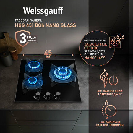 Встраиваемая независимая газовая панель Weissgauff шириной 45 см, исполненная в закалённом чёрном стекле - это стильное и компактное решение для вашей кухни! Ширина 45 см позволит установить газовую панель Weissgauff даже в самую небольшую кухню! Чёрное закаленное стекло не только роскошно выглядит, подчеркивая великолепный внешний вид данной модели, но и отлично справляется с механическими воздействиями и температурными перегрузками! Покрытие Nano Glass это инновационная технология обработки стекла, обеспечивающая великолепный дизайн варочной панели, а также фантастическую легкость очистки благодаря способности этого покрытия препятствовать пригоранию частиц пищи и накоплению жировых отложений! Решетки из высококачественного чугуна это неизменное качество, надежность и долговечность, воплощенные в каждой детали! А особая элегантность их дизайна не только послужит отличным дополнением к общему стилю варочной панели, но и существенно облегчит очистку и уход за ней. А благодаря особому вниманию Weissgauff к каждой детали, вы еще не раз оцените устойчивость и эргономичность этих решеток! WOK-конфорка мощностью 3,4 кВт, которая создаёт сразу три кольца пламени и позволяет осуществить нагрев даже самой крупногабаритной посуды в кратчайший срок! Газ-контроль каждой конфорки обеспечивает наивысшую безопасность: в случае, если пламя погасло, подача газа будет автоматически прекращена! Рукоятки Hi-Tech дополняют современный, по-немецки выверенный облик модели. Более того, конструктивные особенности строения и расположения этих рукояток защищают их от перегрева и деформации при длительном термическом воздействии в процессе приготовления еды! Автоматический электроподжиг, независимо встроенный в каждую из рукояток, позволит зажечь любую конфорку за долю секунды, всего одним нажатием и поворотом руки, не прибегая к дополнительным приспособлениям! Обращаем внимание, что точная ширина данной модели между наиболее выступающими её частями составляет 450 мм.