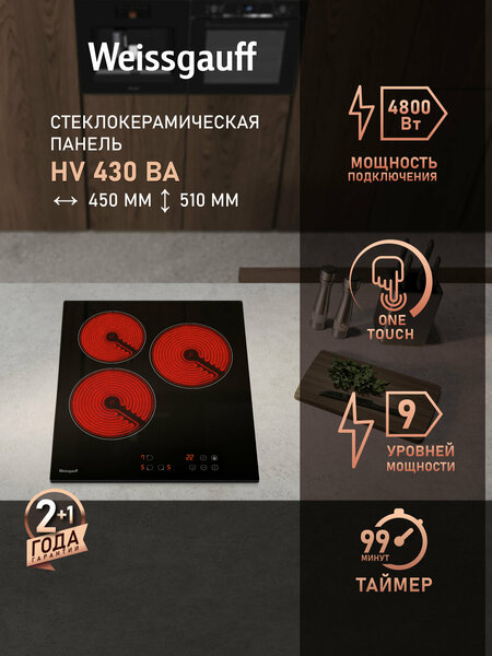 Стеклокерамическая панель Weissgauff HV 430 BA , таймер, блокировка от детей, защитное автоотключение