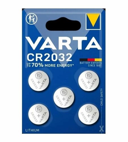 ПараметрЗначениеТипоразмерCR2032 (монетный)Ёмкость230 мАчНапряжение3 В (рабочее 3–3.6 В)Химический составЛитий-диоксид марганца (Li-MnO₂)Количество в упаковке5 шт. Срок храненияДо 7–10 летРабочая температураОт –20°C до +70°C