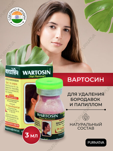 Бородавки вызваны вирусной инфекцией, в частности, вирусом папилломы человека (HPV). Wartosin является уникальным аюрведическим решением для полного удаления выступающих бородавок на лице, лбу, шее, щеках, подмышках и т. д. за 4-5 дней. Применение: • встряхните бутылку перед использованием, до тех пор, пока раствор полностью не перемешается. • очистите бородавку с помощью мягкого мыла и воды. • наносите Wartosin два раза в день, только с помощью вложенного деревянного аппликатора (или зубочистки). • наносите Wartosin только на головку или кончик бородавки, а не на окружающую её кожу. Меры предосторожности: • Wartosin предназначен только для удаления возвышающихся бородавок, т. е. тех, которые выступают из кожного покрова! • позаботьтесь о том, чтобы препарат не попадал на кожу вокруг, и если это так, очистите её влажной ватой или тканью. • после нанесения Wartosin вы можете несколько секунд (минут) ощущать легкое раздражение бородавки, в зависимости от чувствительности кожи. • необходимо наносить очень небольшое количество лекарства! • не наносить более чем на 3-4 бородавки одновременно! • не применять на открытых, вырезанных, поврежденных или кровоточащих бородавках! • применить Wartosin два раза в день, пока бородавка не отпадает. • никогда не используйте ватные палочки, используйте только деревянный аппликатор или зубочистку (заострённую деревянную палочку)! • не наносите на корень или основание бородавки, только на кончик! • не следует использовать на мозолях, прыщах, черных пятнах и родинках и т. д. Противопоказания: Продукт предназначен для использования исключительно на бородавках и папилломах. Наносить мазь на родинки и мозоли нельзя. Это может вызвать сильный ожог дермы. Не стоит мазать сразу все имеющиеся проблемные участки. Покрывать жидкостью разрешается не более 3-4 бородавок одновременно. Запрещается мазать кровоточащие раны и язвы. После открытия бутылки срок хранения препарата – 30 дней. Состав: 1 мл содержит: Khatika - 100 мг, Cuma - 100 мг, Spatigam - 60 мг, Tankana - 60 мг, Karpoor - 10 мг, Розовая вода (основание) Q. S.