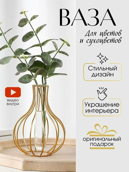 Стильная металлическая ваза декоративная интерьерная для сухоцветов в минималистическом стиле от ZALUCHE впишется в любой декор для интерьера: ванной туалета кухни спальни прихожей детской кабинета, а также гармонично будет смотреться на туалетном столике. В комплект входят металлическая основа и колба из стекла. Интерьерную вазу можно использовать под живые , искусственные цветы и сухоцветы, а также как независимый предмет интерьера. Кованная ваза для цветов выполнена в современном стиле из кованого железа и окрашена в золотой цвет. Колбу можно легко достать и почистить. Для ухода за каркасом рекомендуем использовать мягкую сухую ткань, без использования моющих средств. Прозрачная ваза для цветов отлично подходит как декор для дома интерьера. Золотая ваза с колбой стеклянной упакована в крафт-коробку, что позволяет использовать ее в качестве подарка себе и близким: маме жене бабушке дочери девушке сестре коллеге теще или подруге на Новый год, 8 марта, Именины, День рождения, Пасху или без повода. Настольная металлическая ваза с таким оригинальным дизайном станет изысканным акцентом в интерьере. Наша оригинальная ваза лофт добавит стиля и уюта Вашему дому, будет радовать Вас и Ваших гостей!