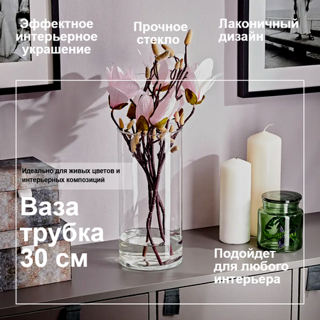 Ваза «Падерборн» высотой 30 см изготовлена из прозрачного стекла с глянцевой поверхностью. Аксессуар, похожий на увеличенный в размерах стакан, поможет создать дизайнерское оформление гостиной, спальни или холла. В такой вазе отлично смотрятся живые или искусственные цветы, композиции из сухих колосьев и веточек. Можно заполнить емкость красивыми камешками, стеклянными или гидрогелевыми шариками, ракушками, декоративным песком и получить эффектное интерьерное украшение.