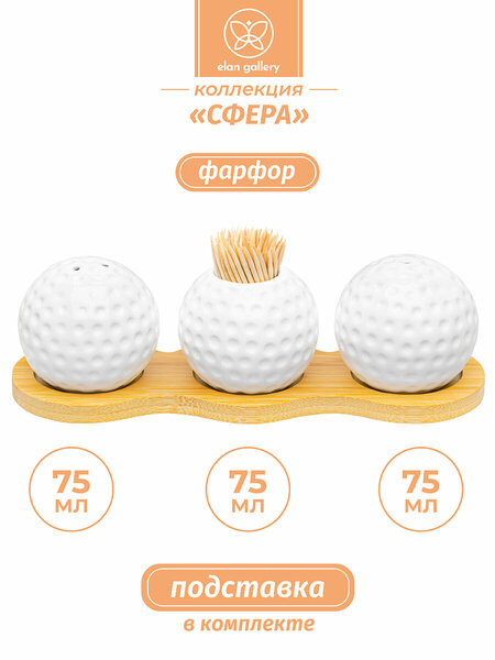 Набор посуды из серии «Сфера» от Elan Gallery предназначен для эстетичной сервировки вашего стола. Включает в себя баночку для зубочисток и набор для специй. Общий размер изделия – 19,5х7х6 см, размер каждой ёмкости – 6х6х5 см, объём – 75 мл. Выполнены из высококачественного белого фарфора. Он не впитывает цвет продуктов и легко отмывается, благодаря чему надолго сохраняет свою белизну. Поверхность изделий украшает частый круглый рельефный узор. Такое изделие отлично дополнит сервировку стола как для сытного завтрака, так и для уютного чаепития. Заполните ёмкости солью и перцем, а также другими специями и приправами. Они помогут держать под рукой всё необходимое во время приготовления пищи. Подайте их вместе с горячими блюдами, чтобы каждый мог приправить пищу по своему вкусу. Наполняются через отверстие снизу и закрываются пластиковой пробкой. Вазочка для зубочисток станет удобной гигиенической принадлежностью. Зубочистки не входят в комплект. Бамбуковая подставка позволит компактно хранить комплект. Не рекомендуется применять абразивные моющие средства. Без деревянной подставки и пластиковых элементов ёмкости подходят для использования в посудомоечной машине и микроволновой печи. Бамбук нельзя замачивать! Набор поставляется в дизайнерской картонной коробке – благодаря ей вам не потребуется дополнительная подарочная упаковка. Фарфоровая сервировочная посуда будет оригинальным подарком для хозяйки, ценящей не только практичность, но и привлекательность. Серия «Сфера» от бренда Элан Галерея станет украшением любого кухонного инвентаря и позволит собрать красивый сервиз в едином стиле!