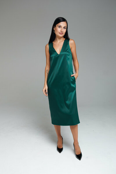 Это женское платье является идеальным выбором для особых мероприятий. Изумрудное, атласное и шелковое, оно станет прекрасным дополнением к вашему гардеробу. Это вечернее платье подойдет как для праздничных моментов, так и для повседневной носки. Благодаря своему элегантному дизайну оно подойдет как на свадьбу или выпускной, так и на деловую встречу или офисный день. Силуэт данного нарядного платья - трапеция, что делает его универсальным в каждом стиле. Широкое платье кроя миди достигает колен и подчеркивает красоту женской фигуры. Оно выглядит стильно и модно, при этом обеспечивая комфорт благодаря своему свободному крою. Летнее с вырезом на груди добавляет изысканности этому коктейльному платью. Каждая дама сможет почувствовать себя особенной в этом прямом образце элегантной одежды. Предложенное нарядное атласное платье смотрится классически и сочетается с любыми аксессуарами.