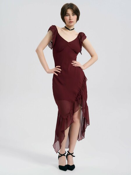 Элегантное платье от бренда твое - воплощение женственности и стиля в каждой детали! Изысканный дизайн с V-образным вырезом, украшенным очаровательным бантиком, создает утонченный образ. Рукава-крылышки добавляют романтичности и легкости, а асимметричная длина (спереди короче, сзади длиннее) подчеркивает вашу индивидуальность. Модель выполнена из 100% полиэстера с подкладкой, что обеспечивает комфорт и долговечность. Благородный бордовый цвет делает платье универсальным, а рюши по низу добавляют игривости и кокетства. Вырез по бедру создает соблазнительный силуэт и подчеркивает достоинства фигуры. Это платье станет вашим верным спутником в любой ситуации: • Летом - легкий и воздушный образ • Весной - идеальный выбор для теплых дней • На праздниках и торжествах - нарядный вариант • На корпоративах и выпускных - элегантный наряд • В офисе - деловой образ под пиджак • В повседневной жизни - стильный и модный лук Подходит как для молодых девушек, так и для женщин, ценящих элегантность и комфорт. Это платье - настоящий хит, который станет основой вашего гардероба и поможет создать множество незабываемых образов для любого случая!