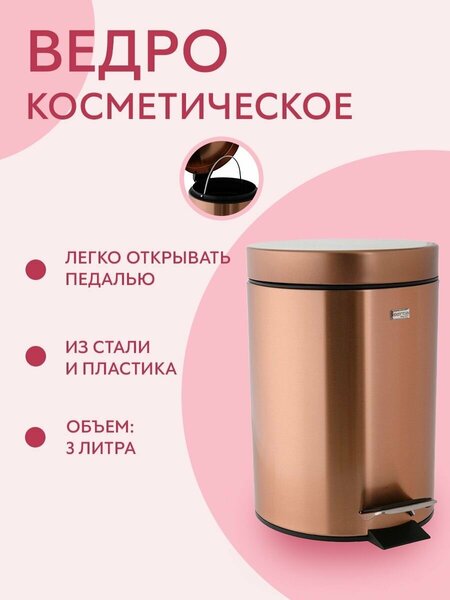 Ведро для мусора AXENTIA Riga круглое объем 3 литра, с педалью и крышкой, из стали окрашенной порошковой краской медного цвета, с внутренним ведром из черного пластика. - Металлическое мусорное ведро вместимостью 3 л оснащено ручкой на шарнире крышки, чтобы его можно было легко перемещать. - Крышка легко открывается с помощью ножной педали из нержавеющей стали, прочной и долговечной, на которой установлена резиновая накладка противоскольжения. Черная пластиковая вставка внутри ведра также имеет практичную ручку. Это позволяет легко извлечь из контейнера и опустошить его. - Ведро косметическое AXENTIA Riga объемом 3 литра имеет пластиковый обод на дне. для бережного отношения к полу. Отлично подойдет для использования в ванной комнате, спальне или рядом с компьютерным столом. - Размер: Ø 17 см, высота 24,5 см, объем 3 литра.