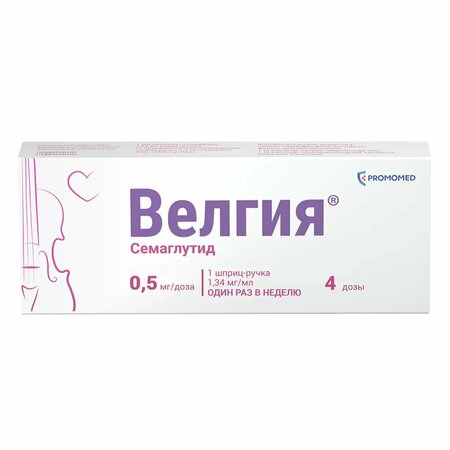 Велгия, 0,5 мг/доза, раствор для подкожного введения В одной предварительно заполненной шприц-ручке содержится 2 мг семаглутида в 1,5 мл раствора препарата, что соответствует 4 дозам по 0,5 мг семаглутида. Каждый мл раствора содержит 1,34 мг семаглутида. Вспомогательные вещества, наличие которых надо учитывать в составе лекарственного препарата: натрий.