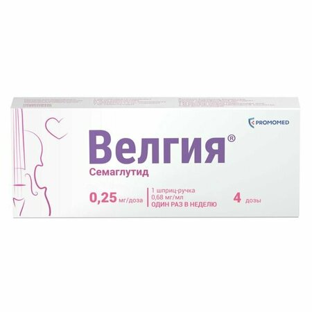 Препарат Велгия содержитДействующим веществом является семаглутид.Велгия, 0,25 мг/доза, раствор для подкожного введенияВ одной предварительно заполненной шприц-ручке содержится 1 мг семаглутида в 1,5 мл раствора препарата, что соответствует 4 дозам по 0,25 мг семаглутида.Каждый мл раствора содержит 0,68 мг семаглутида.Велгия, 0,5 мг/доза, раствор для подкожного введенияВ одной предварительно заполненной шприц-ручке содержится 2 мг семаглутида в 1,5 мл раствора препарата, что соответствует 4 дозам по 0,5 мг семаглутида.Каждый мл раствора содержит 1,34 мг семаглутида.Велгия, 1 мг/доза, раствор для подкожного введенияВ одной предварительно заполненной шприц-ручке содержится 4 мг семаглутида в 3 мл раствора препарата, что соответствует 4 дозам по 1 мг семаглутида.Каждый мл раствора содержит 1,34 мг семаглутида.Велгия, 1,7 мг/доза, раствор для подкожного введенияВ одной предварительно заполненной шприц-ручке содержится 6,8 мг семаглутида в 3 мл раствора препарата, что соответствует 4 дозам по 1,7 мг семаглутида.Каждый мл раствора содержит 2,27 мг семаглутида.Велгия, 2,4 мг/доза, раствор для подкожного введенияВ одной предварительно заполненной шприц-ручке содержится 9,6 мг семаглутида в 3 мл раствора препарата, что соответствует 4 дозам по 2,4 мг семаглутида.Каждый мл раствора содержит 3,2 мг семаглутида.Прочими ингредиентами (вспомогательными веществами) являются: натрия гидрофосфата дигидрат, фенол, пропиленгликоль, 1 М раствор натрия гидроксида или 1 М раствор хлороводородной кислоты, вода для инъекций.Препарат Велгия содержит натрий (см. раздел 2).