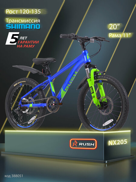 Горный детский велосипед RUSH NX205 20" дюймов с дисковыми тормозами для девочек ростом 120-135 см. Рама хардтейл 11" с заводской гарантией 5 лет изготовлена из высоколегированной стали HI-TEN с применением технологии техноформинга и внутренней проводки тросов. Трансмиссия 6 скоростная, задний переключатель SHIMANO TY200, на руле манетки SHIMANO RS-25. Вилка серии NS пружинно-эластомерная с ходом 50 мм, обеспечит больший комфорт при катании. На штанах вилки установлены пыльники, которые защищают хромированные ноги от воздействия пыли и грязи. Двойной алюминиевый обод рассчитан на нагрузку до 120 кг. Широкие покрышки обеспечат отличный накат и сцепление с дорогой. Мягкое сиденье с покрытием SOFT TOUCH регулируется по высоте без ключей, с помощью эксцентрика. Вес велосипеда 13,9 кг. На нижней трубе есть крепеж для держателя бутылки или насоса. Крылья, подножка и защита цепи в подарок. Мы контролируем все этапы создания велосипедов RUSH HOUR: контроль входящих комплектующих; правильность установки и настройки оборудования; взвешивание; проверка комплектности и правильности упаковки. RUSH HOUR NX 205 код 388051