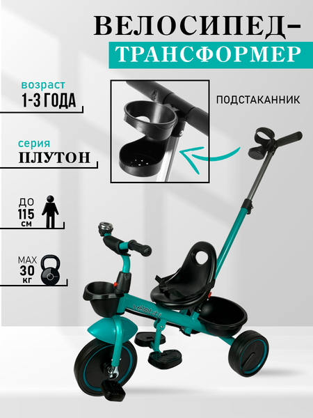 Велосипед-трансформер "Плутон" трёхколесный с ручкой, нагрузка до 30 кг, для детей от 1+, бирюза