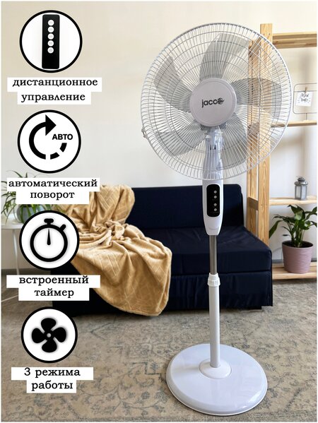 Вентилятор напольный JACOO JFS-1750 электрический, с пультом управления, 3 режима скорости, белый, мощность 40 Вт